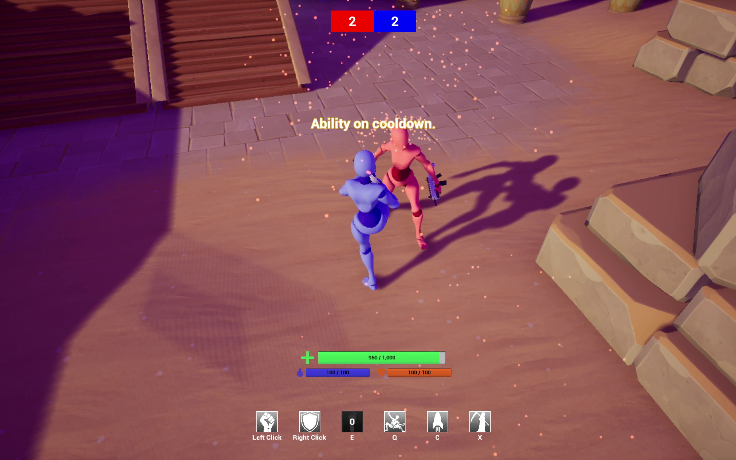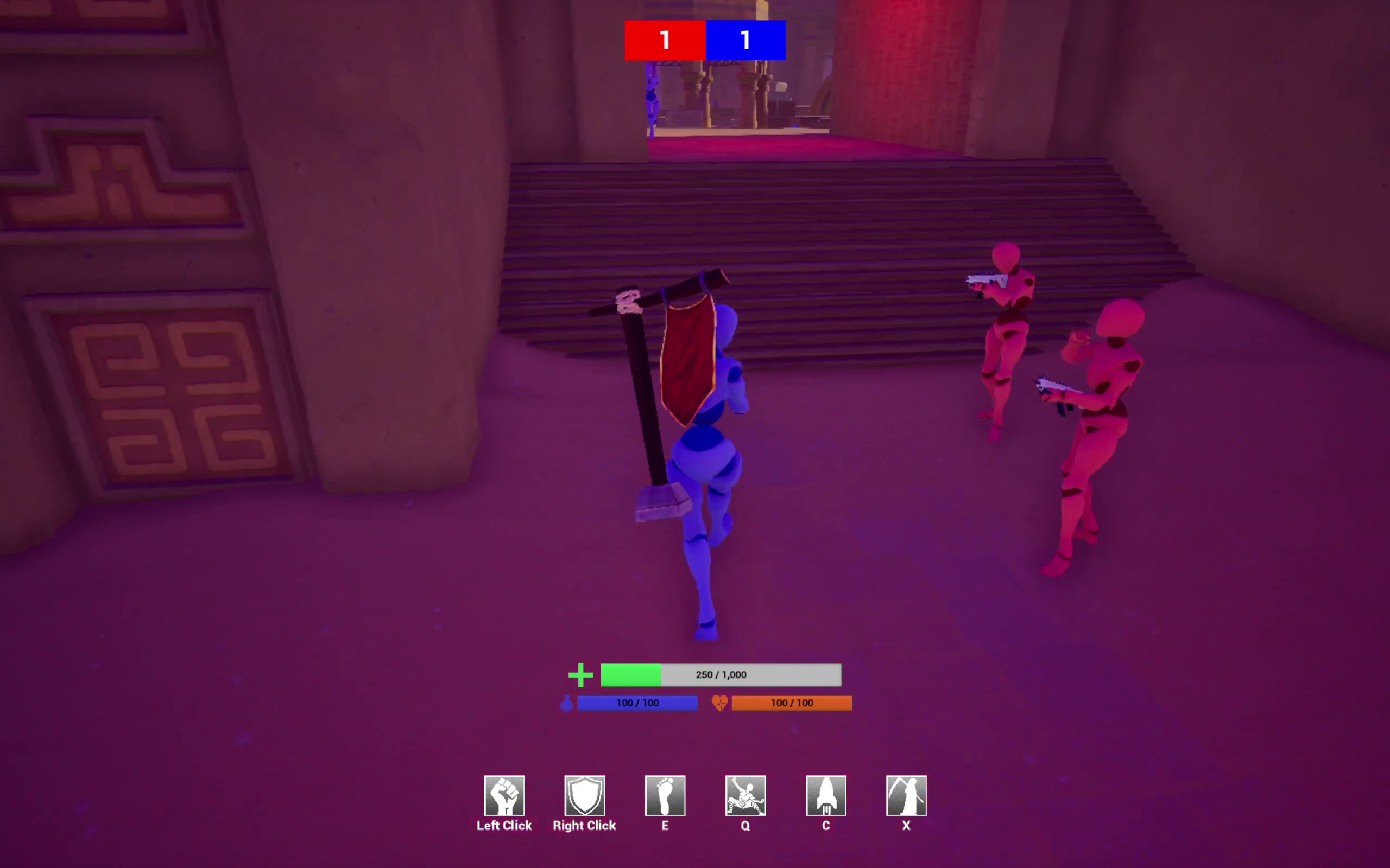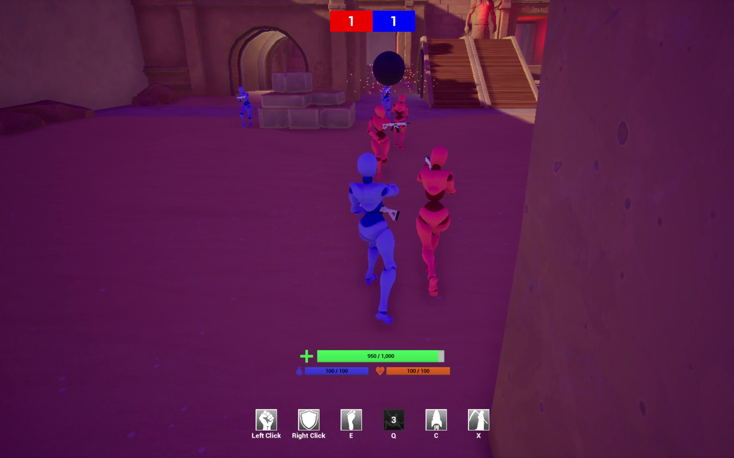 Everyone respawns at their fort when they die. Your primary attack is to shoot. You have the option to throw a grenade at opponents at a distance and use melee attacks (buttstroke or kick) on close-by ones.